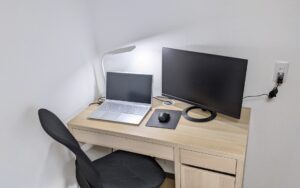 2枚目のAfter写真では、増設されたコンセントから書斎の机上にあるPCへ電気が供給されている状態が確認できます。延長コードを使用せずに直接接続できるため、足元もすっきりとし、作業に集中できる環境が整いました。